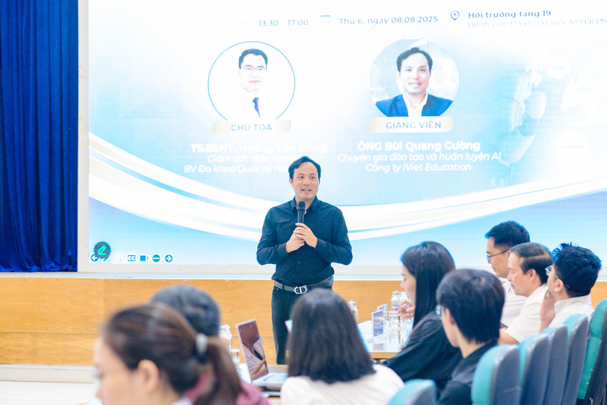 Hội thảo với mục tiêu cập nhật xu hướng, ứng dụng trí tuệ nhân tạo (AI) vào thực tiễn, không ngừng nâng cao hiệu quả hoạt động và chất lượng chăm sóc sức khỏe tại Bệnh viện. Phát biểu khai mạc, TS. BSNT. Hoàng Văn Dũng – Giám đốc điều hành Bệnh viện đa khoa quốc tế Hải Phòng cũng nhấn mạnh: Bệnh viện đã tiên phong cả nước triển khai thành công Bệnh án điện tử. Trên nền tảng đó, việc ứng dụng trí tuệ nhân tạo AI sẽ là bước đi quan trọng nhằm trang bị kiến thức, kỹ năng ứng dụng AI cho đội ngũ nhân viên y tế, từ đó hội nhập với nền y tế hiện đại.