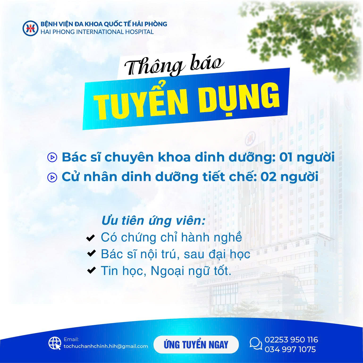BỆNH VIỆN ĐA KHOA QUỐC TẾ HẢI PHÒNG THÔNG BÁO TUYỂN DỤNG