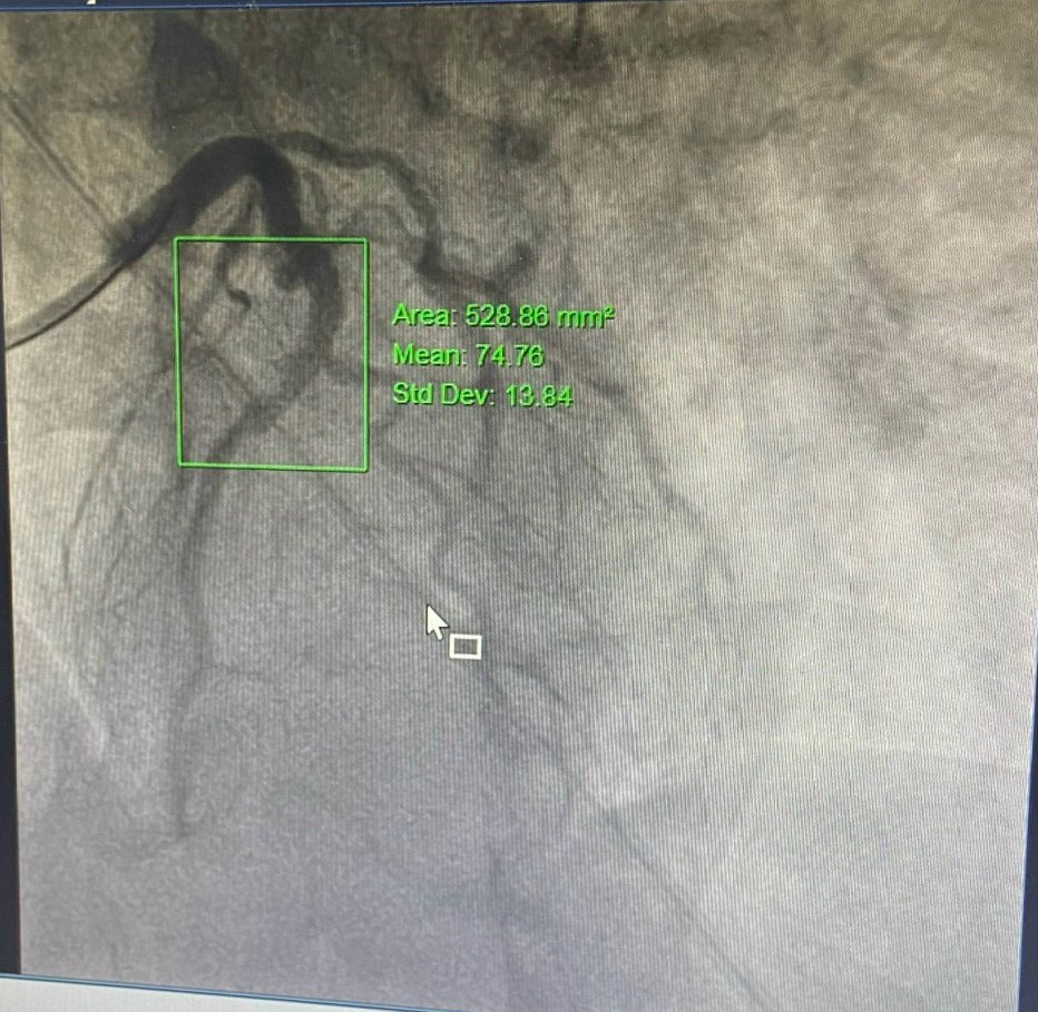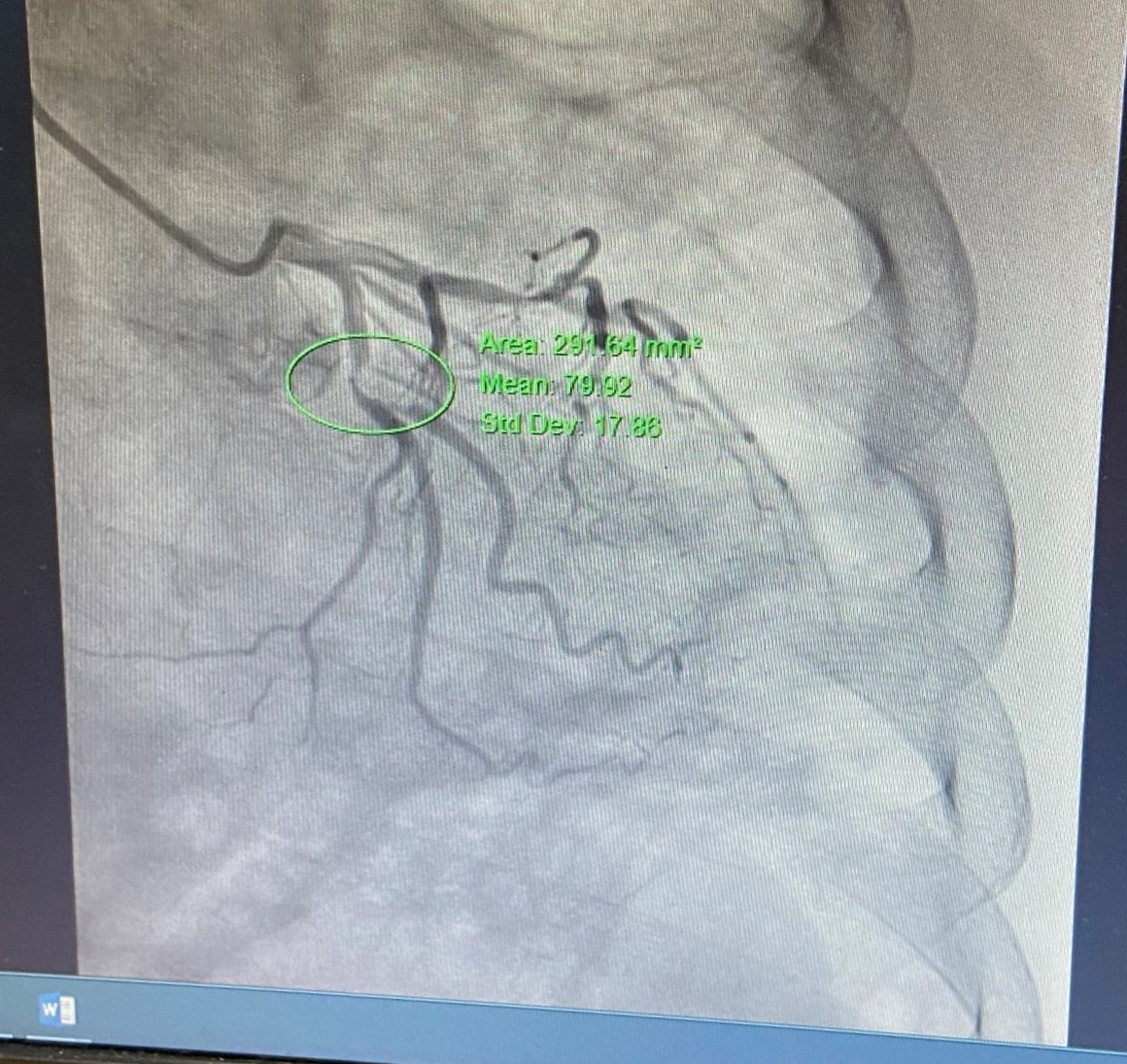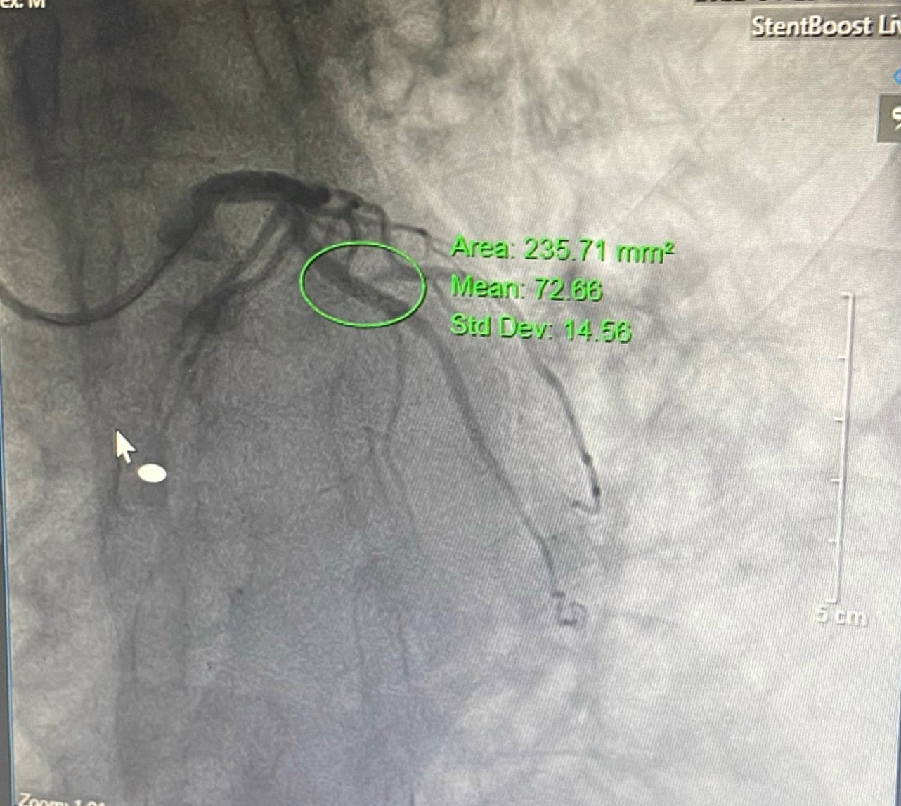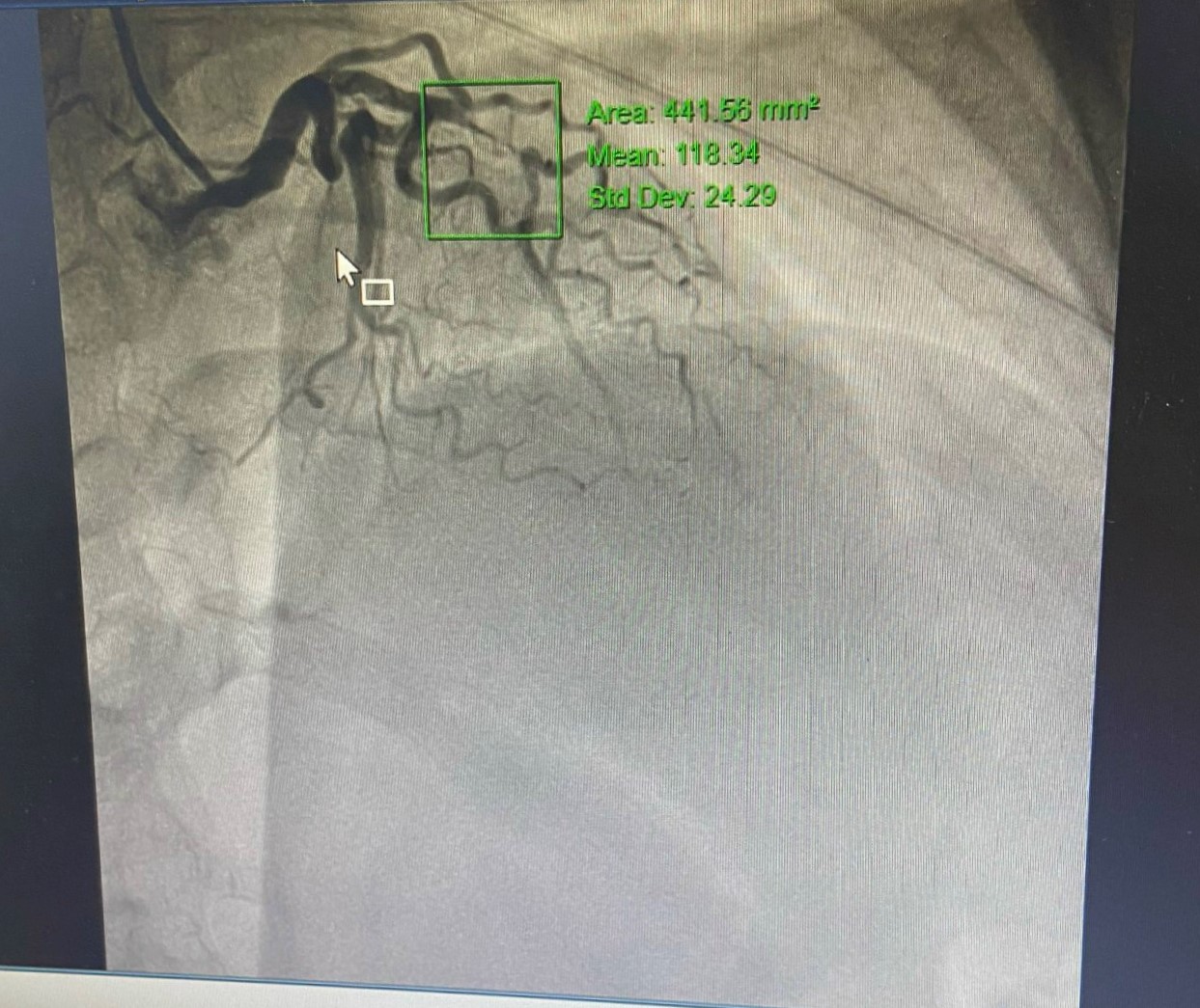 Kết quả chụp mạch vành cho thấy, hẹp 99% động mạch liên thất trước LAD I-II. Ngay lập tức, bệnh nhân được kíp Ths.BSNT Vũ Học Huấn – Trưởng Khoa Tim mạch – Đột quỵ, Ths.BS Phạm Văn Thuận cùng cộng sự thực hiện kỹ thuật can thiệp đặt 1stent mạch vành. Nhờ được phát hiện, can thiệp cấp cứu kịp thời mà bệnh nhân đã thoát khỏi giai đoạn nguy hiểm, đang dần phục hồi. Ghi nhận kỹ thuật đạt kết quả tốt.