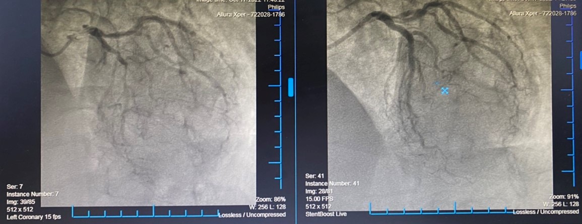 Sau khi đã hội chẩn và thống nhất các phương án điều trị, xác định thủ phạm chính gây nhồi máu cơ tim cấp lần này là Động mạch vành bên trái vị trí thân chung và hẹp khít LAD2, bệnh nhân được can thiệp đặt 2 Stent LM – LAD2. Ekip can thiệp đã rất thận trọng, tiến hành mở thông hoàn toàn thân chung động mạch vành trái, đặt 2 stent thành công. Quá trình can thiệp thuận lợi, sau can thiệp, bệnh nhân đã hết đau ngực, khó thở và hồi phục tốt.
