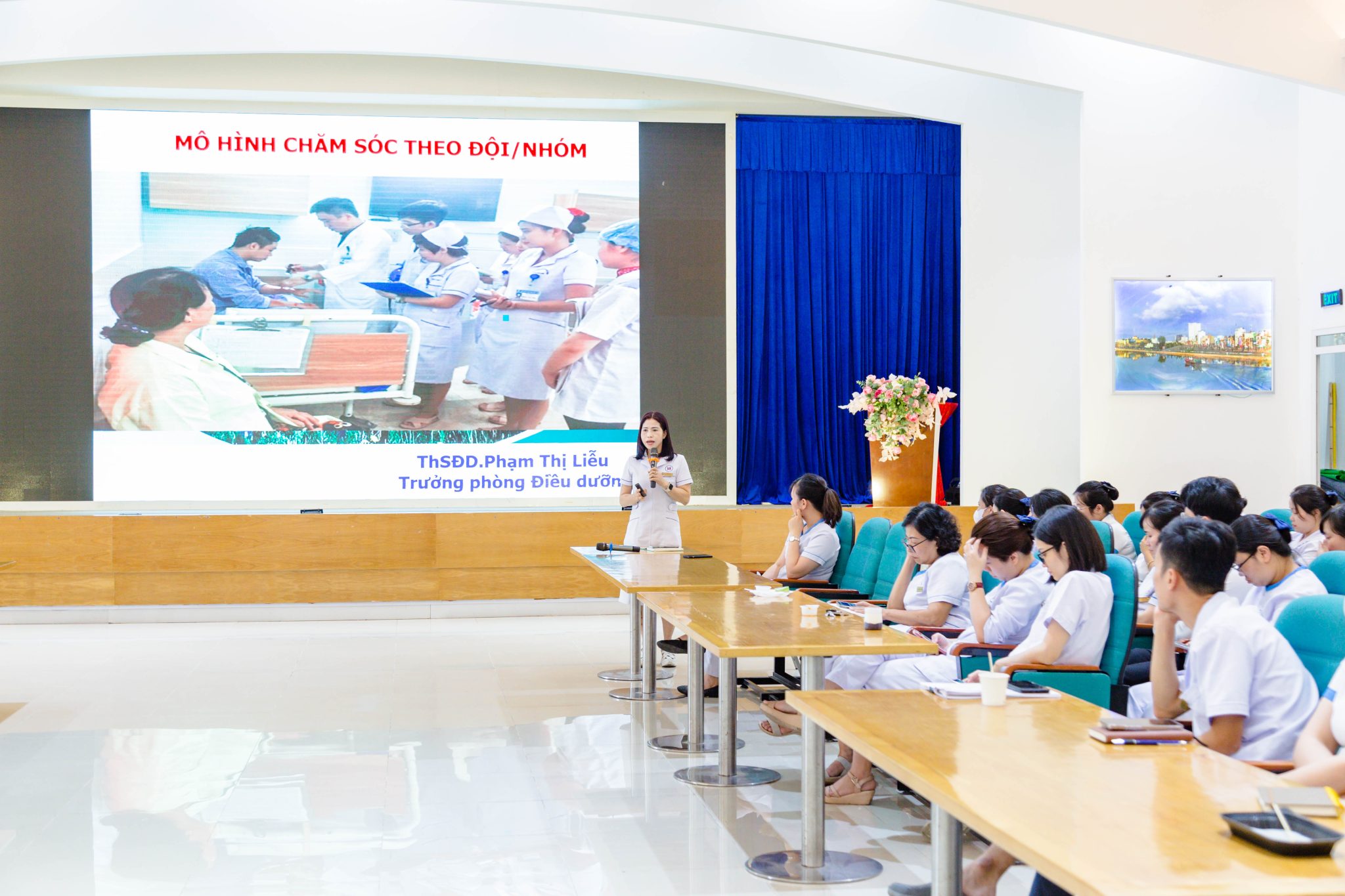 Tại chương trình, Ths. Phạm Thị Liễu – Trưởng Phòng Điều dưỡng Bệnh viện đã giới thiệu tổng quan về mô hình chăm sóc đội/nhóm; chia sẻ những ưu điểm của mô hình trong việc phối hợp hiệu quả giữa các thành viên trong đội chăm sóc đa thành phần nhằm bảo đảm sự thống nhất trong điều trị, theo dõi chặt chẽ để phát hiện kịp thời các dấu hiệu bất thường, phân cấp chăm sóc chuẩn, lập kế hoạch, can thiệp đúng, tư vấn sức khỏe tùy theo đặc điểm từng bệnh cũng như cung cấp dinh dưỡng, hỗ trợ phục hồi chức năng….. Từ đó nâng cao chất lượng chăm sóc, đồng thời làm tăng sự hài lòng của người bệnh/người nhà người bệnh trong quá trình đến khám và điều trị tại Bệnh viện.