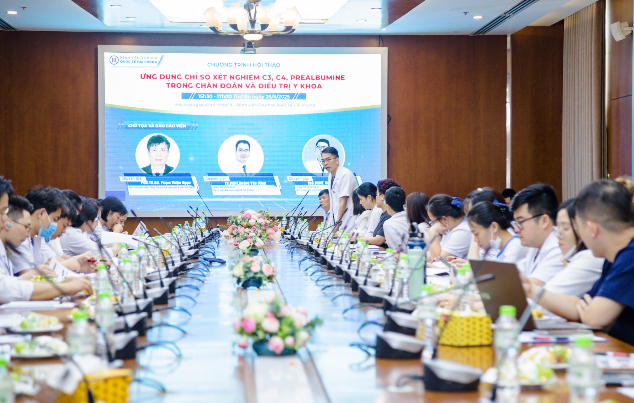 Chiều ngày 26/8, Bệnh viện đa khoa Quốc tế Hải Phòng đã tổ chức thành công chương trình hội thảo khoa học với chủ đề: “Ứng dụng chỉ số xét nghiệm C3, C4, Prealbumin trong chẩn đoán và điều trị y khoa”. Hội thảo quy tụ nhiều chuyên gia, bác sĩ đầu ngành: TS.BSNT. Hoàng Văn Dũng – Giám đốc điều hành Bệnh viện đa khoa Quốc tế Hải Phòng; PGS.TS.BS. Phạm Thiện Ngọc – Phó Chủ tịch kiêm Tổng Thư ký Hội Hóa sinh Y học Việt Nam; ThS.BSNT. Nguyễn Việt Khánh – Khoa Nội tổng hợp 2 Bệnh viện đa khoa Quốc tế Hải Phòng và đông đảo y bác sĩ trong hệ thống Bệnh viện, Phòng khám thuộc Tổng Công ty Hàng Kênh cùng nhau trao đổi, cập nhật kiến thức và chia sẻ kinh nghiệm chuyên môn.