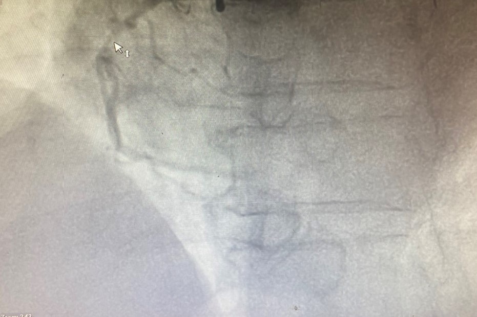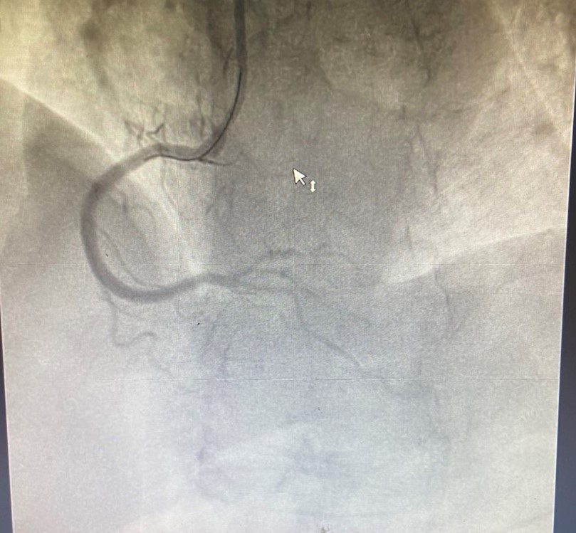 Bệnh nhân ngay sau đó được chỉ định chụp động mạch vành qua da, kết quả chụp xác định tổn thương dài, lan tỏa, hẹp 99% động mạch vành phải; 80-90% động mạch mũ, xơ vữa hẹp rải rác 50% động mạch liên thất trước. Dựa vào điện tim và lâm sàng, các bác sĩ đánh giá thủ phạm dẫn đến nhồi máu cơ tim lần này chính là động mạch vành phải gần tắc hoàn toàn của bệnh nhân. Nếu không được can thiệp kịp thời sẽ nguy hiểm đến tính mạng của người bệnh. Khi ấy, kíp Ths.BSNT Vũ Học Huấn – Trưởng Khoa Tim mạch – Đột quỵ, Ths.BS Phạm Văn Thuận cùng cộng sự đã nhanh chóng tiến hành kỹ thuật can thiệp đặt 2 stent động mạch vành phải thành công. Kết quả can thiệp tốt, ghi nhận sau đặt mạch vành tái thông, bệnh nhân hết đau ngực, nhịp tim cải thiện, sức khỏe dần phục hồi.