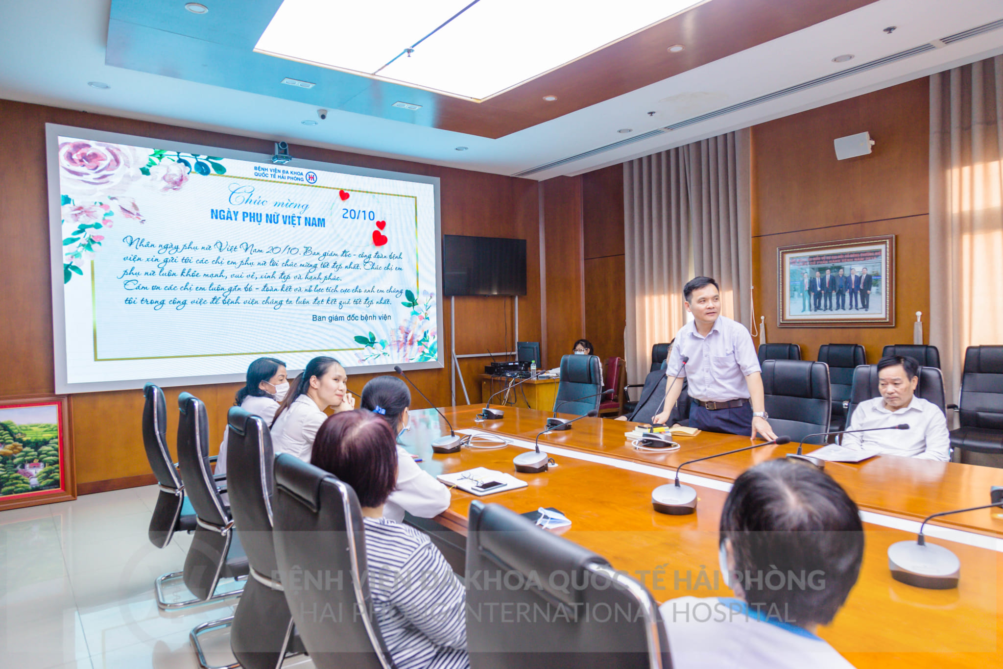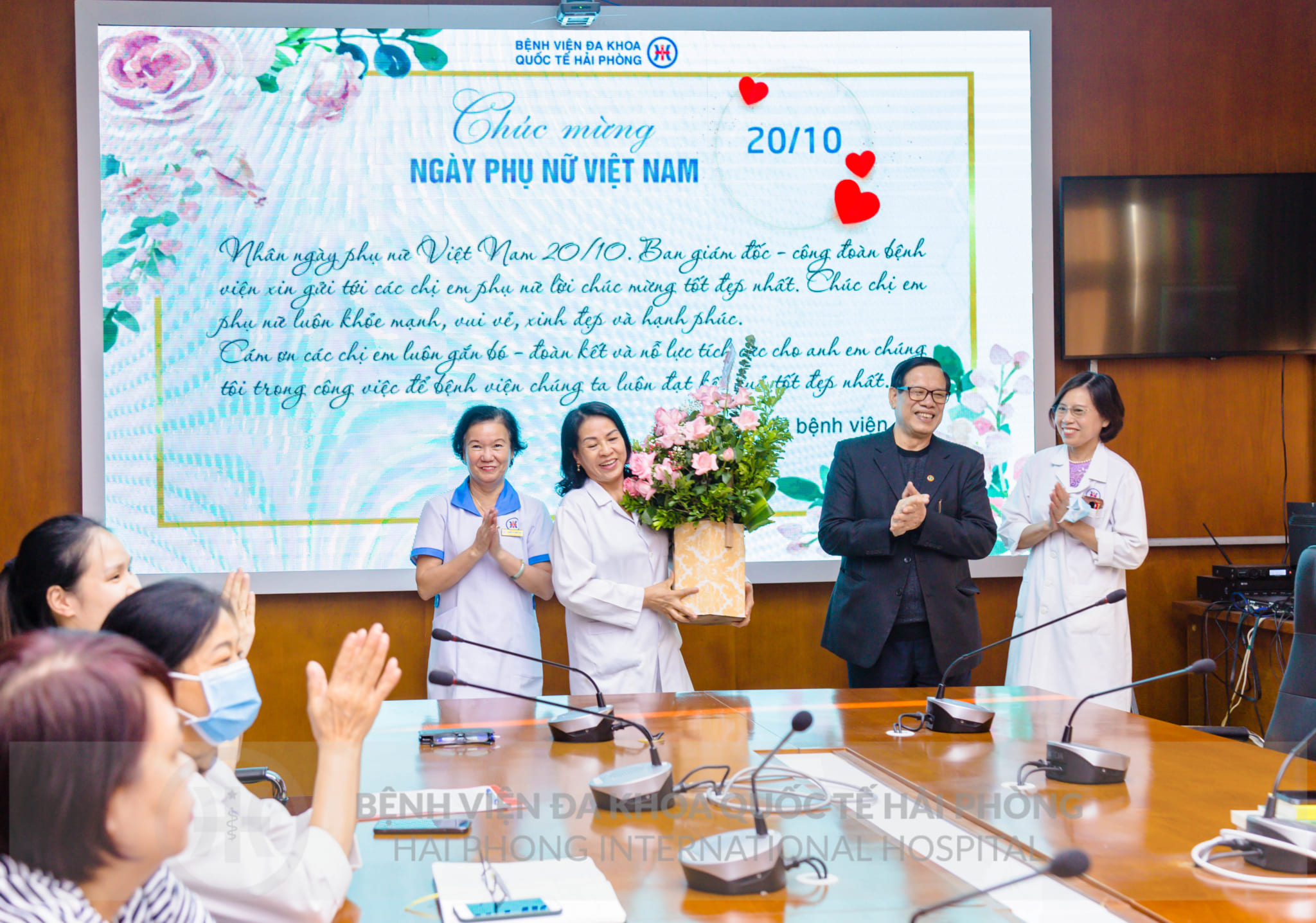 Cũng tại lễ công bố đầy ý nghĩa này, lãnh đạo Tổng công ty và Bệnh viện đã gửi những bó hoa tươi thắm cùng lời chúc mừng tốt đẹp nhất đến các nữ bác sỹ , điều dưỡng, cán bộ nhân viên đang công tác tại Bệnh viện đa khoa Quốc tế Hải Phòng nhân Ngày Phụ nữ Việt Nam 20/10. Chúc chị em luôn xinh đẹp, khỏe mạnh và hạnh phúc; cảm ơn mọi người đã luôn gắn bó, đoàn kết và nỗ lực tích cực để bệnh viện luôn gặt hái được những thành quả tốt đẹp nhất.