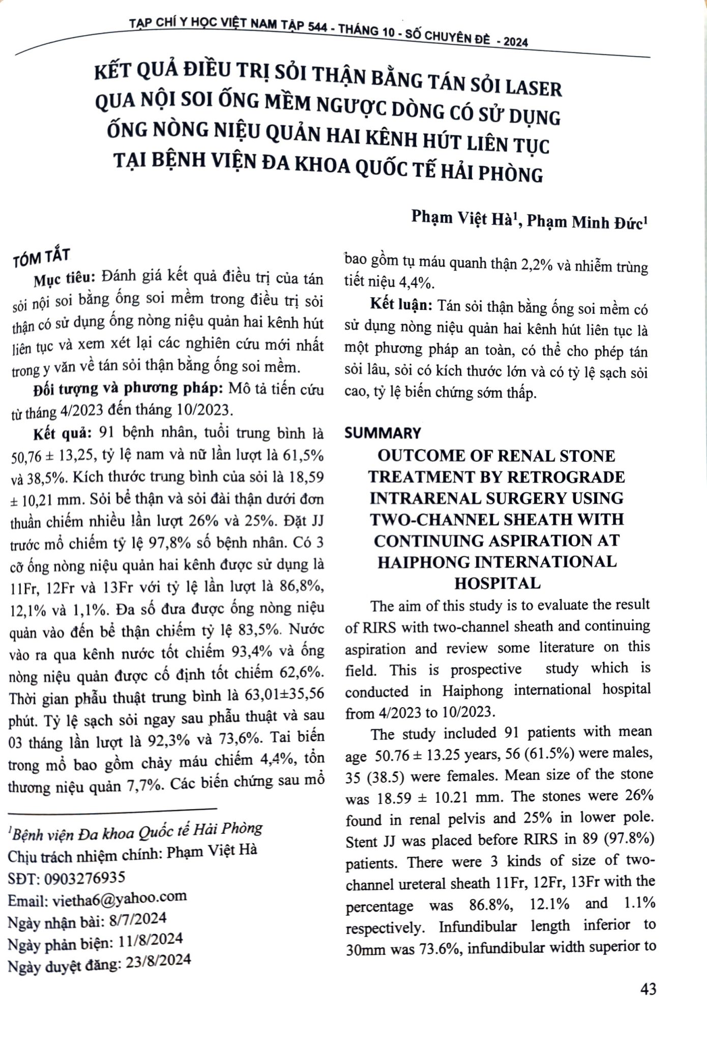 ĐỀ TÀI NGHIÊN CỨU: “KẾT QUẢ ĐIỀU TRỊ SỎI THẬN BẰNG TÁN SỎI LASER QUA NỘI SOI ỐNG MỀM NGƯỢC DÒNG CÓ SỬ DỤNG ỐNG NÒNG NIỆU QUẢN HAI KÊNH HÚT LIÊN TỤC TẠI BỆNH VIỆN ĐA KHOA QUỐC TẾ HẢI PHÒNG” ĐƯỢC ĐĂNG TẢI TRÊN TẠP CHÍ Y HỌC VIỆT NAM