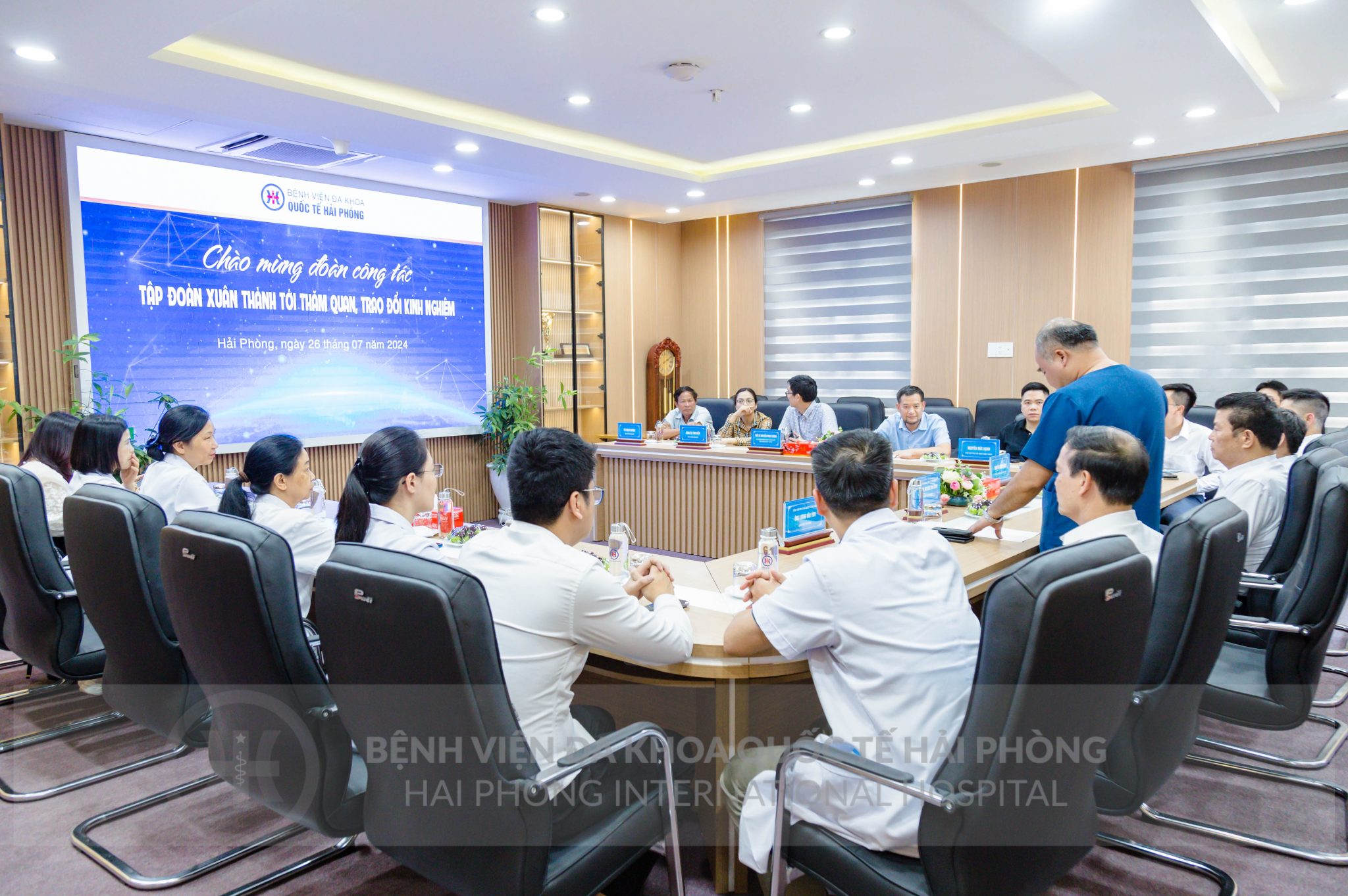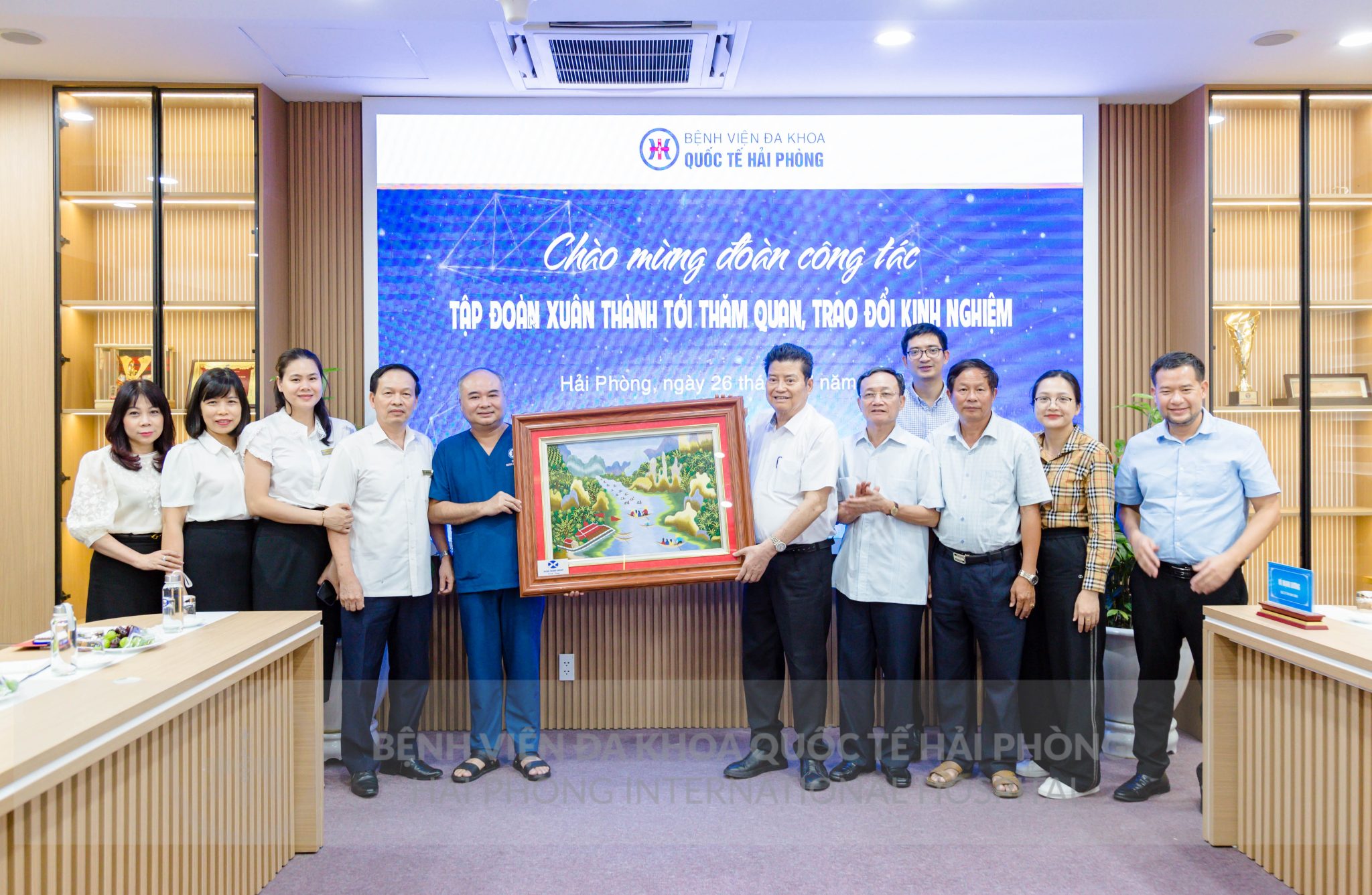 Chiều ngày 26/7, Đoàn công tác tập đoàn Xuân Thành do ông Nguyễn Xuân Thành – Chủ tịch Tập đoàn làm trưởng đoàn đã đến thăm quan, trao đổi kinh nghiệm tại Bệnh viện đa khoa quốc tế Hải Phòng. Đón tiếp đoàn, về phía Bệnh viện có ThS.BSNT. Nguyễn Thái Bình – Giám đốc chuyên môn hệ Nội; ông Lương Văn Tích – Giám đốc Tài chính cùng đại diện lãnh đạo các Khoa/Phòng của Bệnh viện đa khoa quốc tế Hải Phòng.