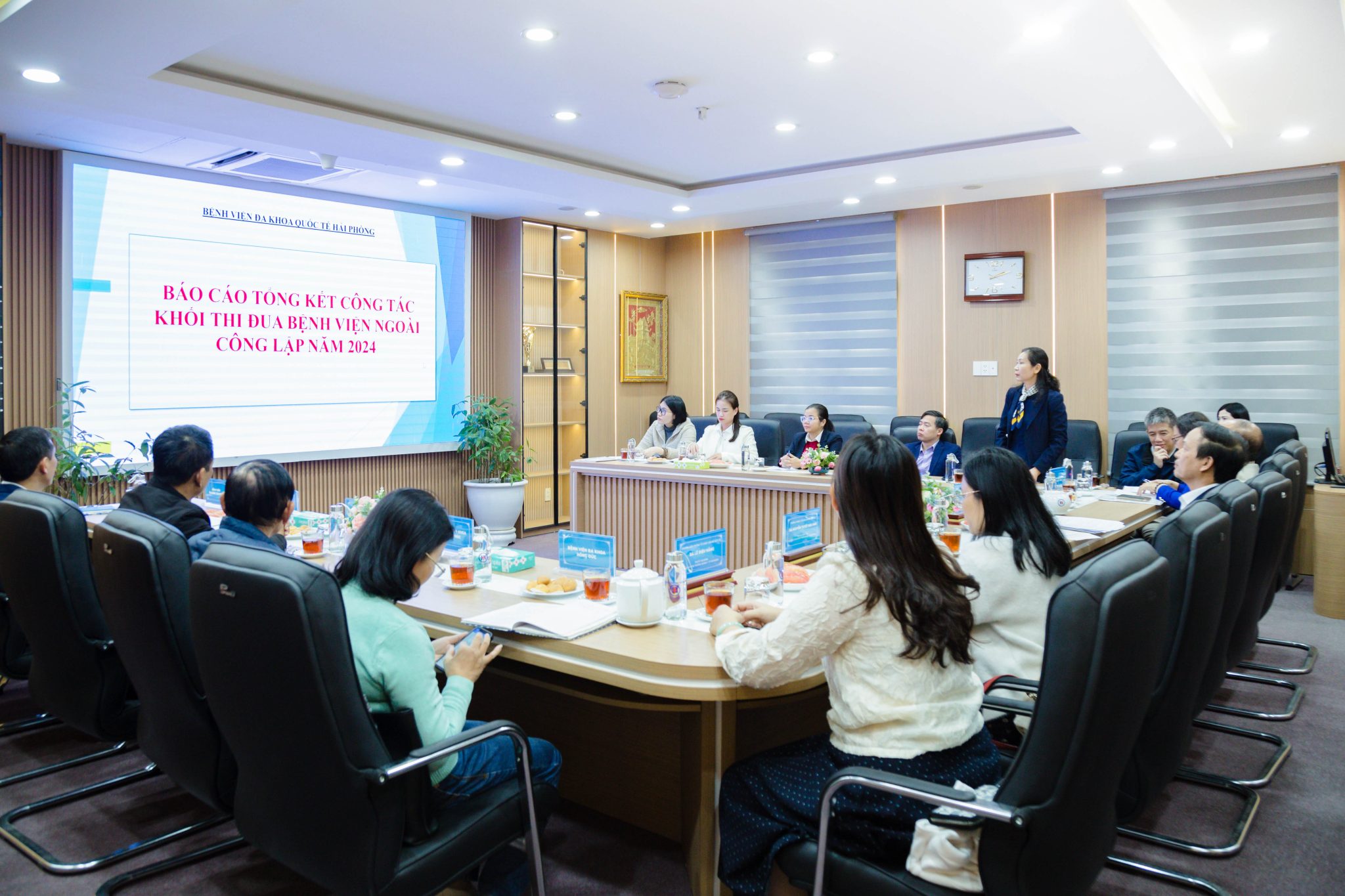 Khối thi đua bệnh viện ngoài công lập gồm 09 bệnh viện: Bệnh viện đa khoa Quốc tế Hải Phòng, Bệnh viện Quốc tế Sản Nhi Hải Phòng, Bệnh viện đa khoa Quốc tế Hải Phòng – Vĩnh Bảo; Bệnh viện đa khoa Quốc tế Vinmec Hải Phòng, Bệnh viện Quốc tế Green, Bệnh viện đa khoa Gold Star, Bệnh viện Phụ sản Tâm Phúc, Bệnh viện đa khoa Hồng Đức và Bệnh viện đa khoa Hồng Phúc. Thay mặt khối thi đua, Bệnh viện đa khoa Quốc tế Hải Phòng – đơn vị khối trưởng năm 2024 đã báo cáo đánh giá tình hình triển khai công tác thi đua của Khối; tổng hợp kết quả tự chấm điểm tiêu chí thi đua năm 2024 của 09 đơn vị. Trong năm 2024, các Bệnh viện trong Khối đã thực hiện tốt hoàn thành vượt mức chỉ tiêu chuyên môn của đơn vị, ngành, thành phố giao. Nhiều bệnh viện trong Khối thi đua đã được Hiệp hội bệnh viện tư nhân Việt Nam xét khen thưởng cho các tập thể và cá nhân có thành tích xuất sắc đóng góp cho sự phát triển của Hệ thống và sự nghiệp chăm sóc bảo vệ sức khỏe nhân dân.