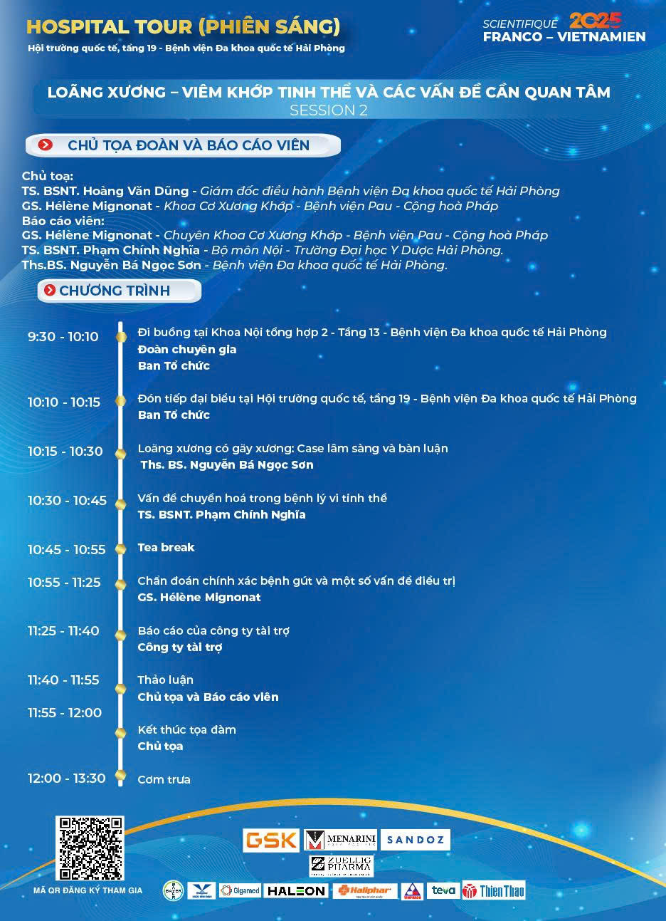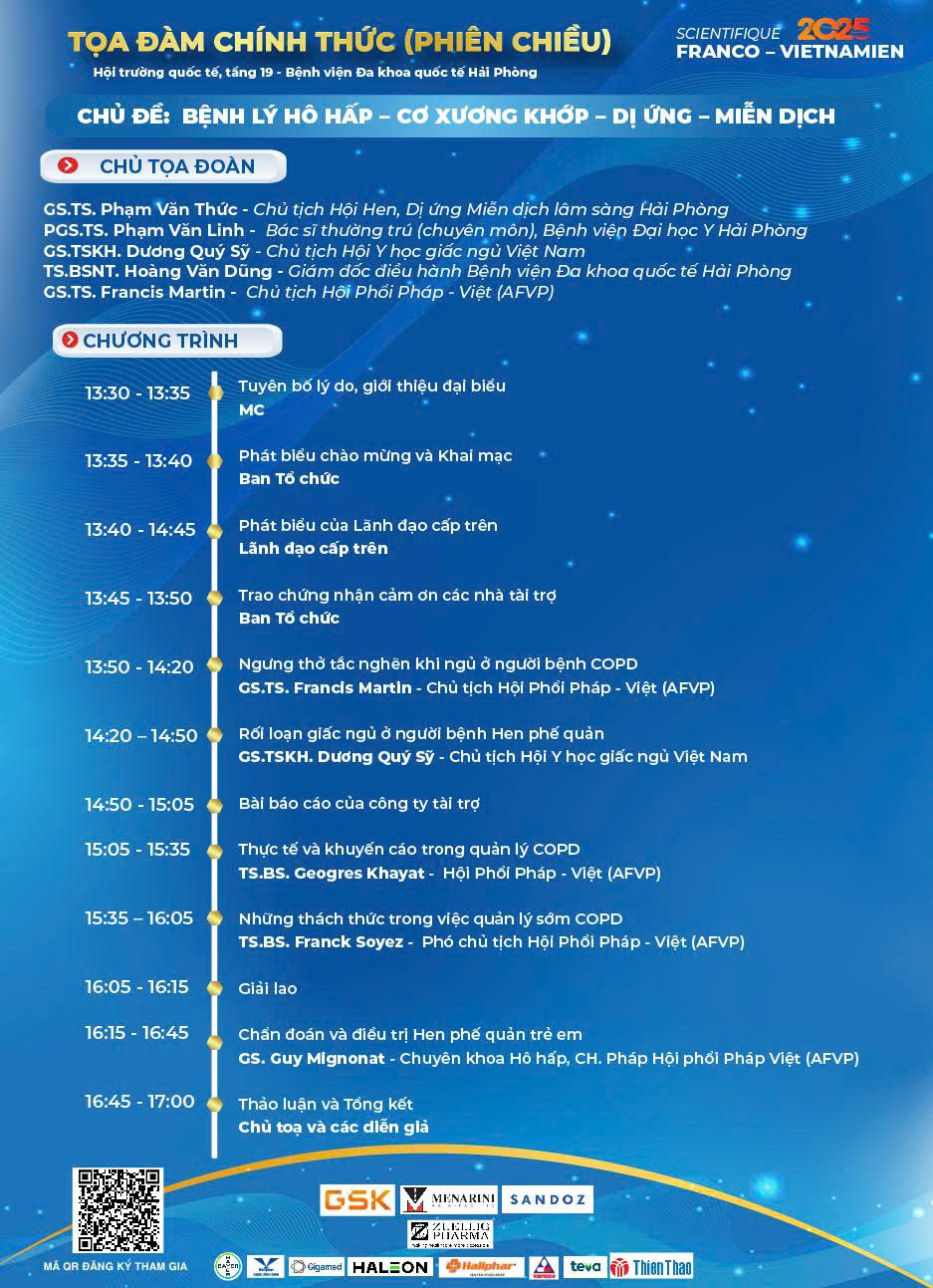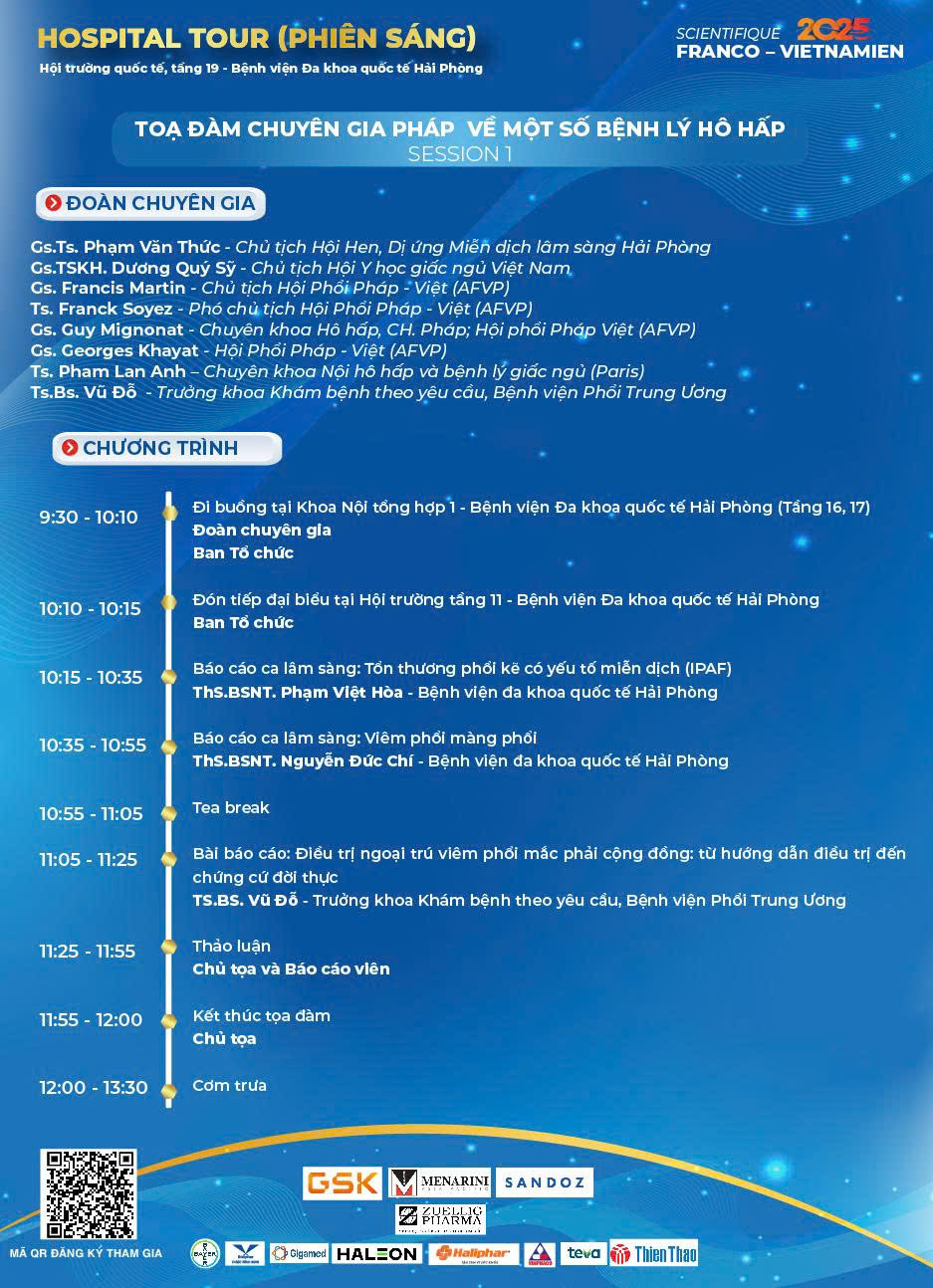 Chương trình quy tụ các chuyên gia đầu ngành đến từ Hội Phổi Pháp – Việt; bác sĩ chuyên khoa Nội chung, Hô hấp, Cơ Xương Khớp, Dị ứng – Miễn dịch trong và ngoài nước cùng cập nhật, chia sẻ những tiến bộ mới trong Y học và các hướng tiếp cận hiện đại trong điều trị, phục hồi. Đặc biệt, qua các ca lâm sàng thực tế khi đi buồng bệnh, các chuyên gia, bác sĩ sẽ cùng thảo luận chuyên sâu, trao đổi kinh nghiệm trong chẩn đoán và điều trị tối ưu cho người bệnh.