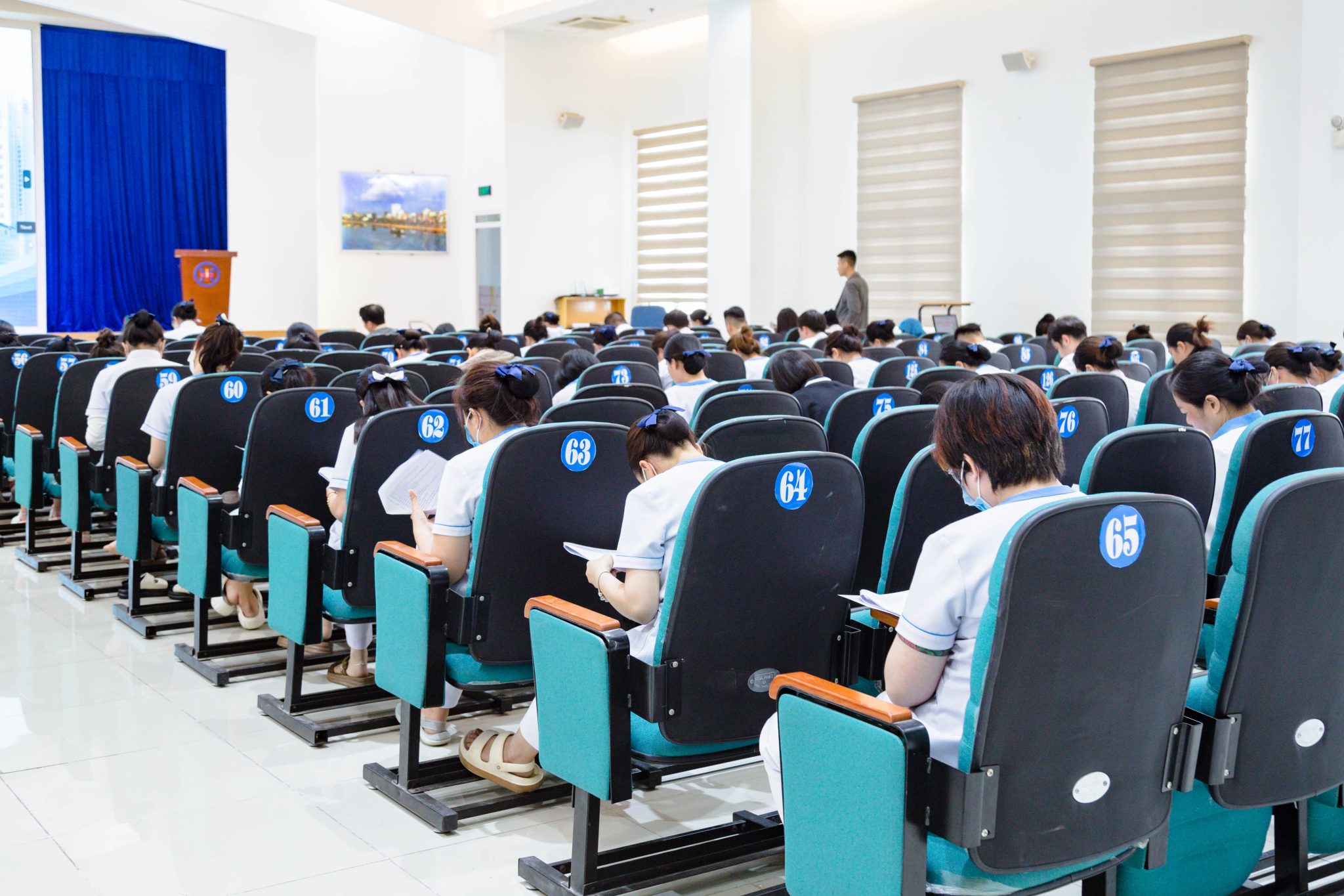 Các thí sinh bao gồm các bác sĩ, điều dưỡng, dược sĩ, nhân sự khối phòng ban… sẽ tham gia kiểm tra với tổng số 60 câu hỏi theo trình độ chuyên môn và nhóm chuyên khoa mà mình đang công tác với thời gian làm bài 30 phút. Mỗi ngày chia làm 2 ca thi, nội dung bao gồm các câu hỏi dưới hình thức trắc nghiệm. Công tác kiểm tra ngày thứ nhất đã được triển khai đảm bảo đúng tiến độ, đúng quy trình, công khai và minh bạch với sự làm việc nghiêm túc của Hội đồng kiểm tra và sự tham gia đầy đủ của các thí sinh.