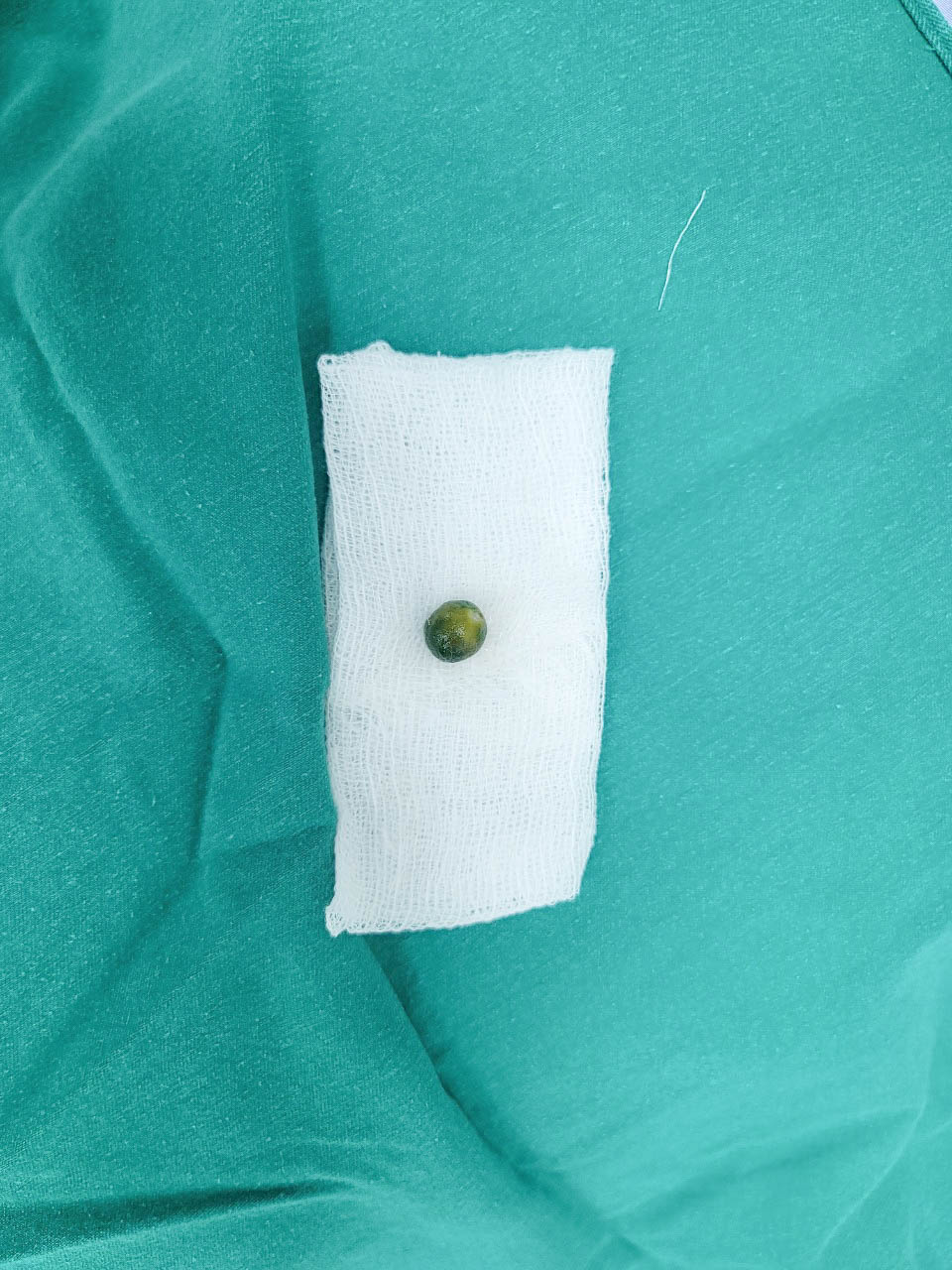 21h20, ngày 16/8, bệnh nhân nam 83 tuổi vào Khoa Cấp cứu, Bệnh viện đa khoa Quốc tế Hải Phòng trong tình trạng khó thở, lơ mơ, tím môi, tím đầu chi. Người nhà cho biết khoảng 5-6 ngày nay, bệnh nhân ho nhiều, tự điều trị thuốc đỡ ít; ăn uống dễ ho sặc. Nhanh chóng, người bệnh được đặt ống nội khí quản, thở máy; đồng thời kết quả cận lâm sàng chẩn đoán bệnh nhân suy hô hấp, viêm phổi, hình ảnh chụp giãn phế quản bội nhiễm, dị vật lòng phế quản gốc phải. Nhận định tình trạng dị vật đường hô hấp nghiêm trọng, bác sĩ gấp rút hội chẩn, tiến hành nội soi phế quản tại giường cấp cứu. Quá trình nội soi, dị vật bít gần hoàn toàn lòng phế quản, mủ trắng từ dưới trào lên, kích thước dị vật nhỏ, bề mặt tròn, nhẵn, trơn nên việc lấy ra rất khó khăn. Ekip đã cẩn thận phối hợp tiến hành đưa dị vật vào cố định trong rọ, rút ống nội soi đồng thời rút ống nội khí quản đưa thành công dị vật ra ngoài là “1 quả quất” đường kích 14mm. Sau gắp, bệnh nhân tiếp tục được điều trị tích cực, nâng cao thể trạng, tình trạng dần ổn định; hiện tại đã tỉnh táo, rút ống nội khí quản và thở oxy kính. Dị vật đường thở là tình trạng bệnh lý rất nguy hiểm, có thể gây suy hô hấp, thậm chí là tử vong nếu không được phát hiện và xử trí kịp thời. Qua trường hợp trên, ngay khi chúng ta và người nhà có vấn đề bất thường về sức khỏe cần đến ngay cơ sở y tế để được phát hiện và điều trị kịp thời.