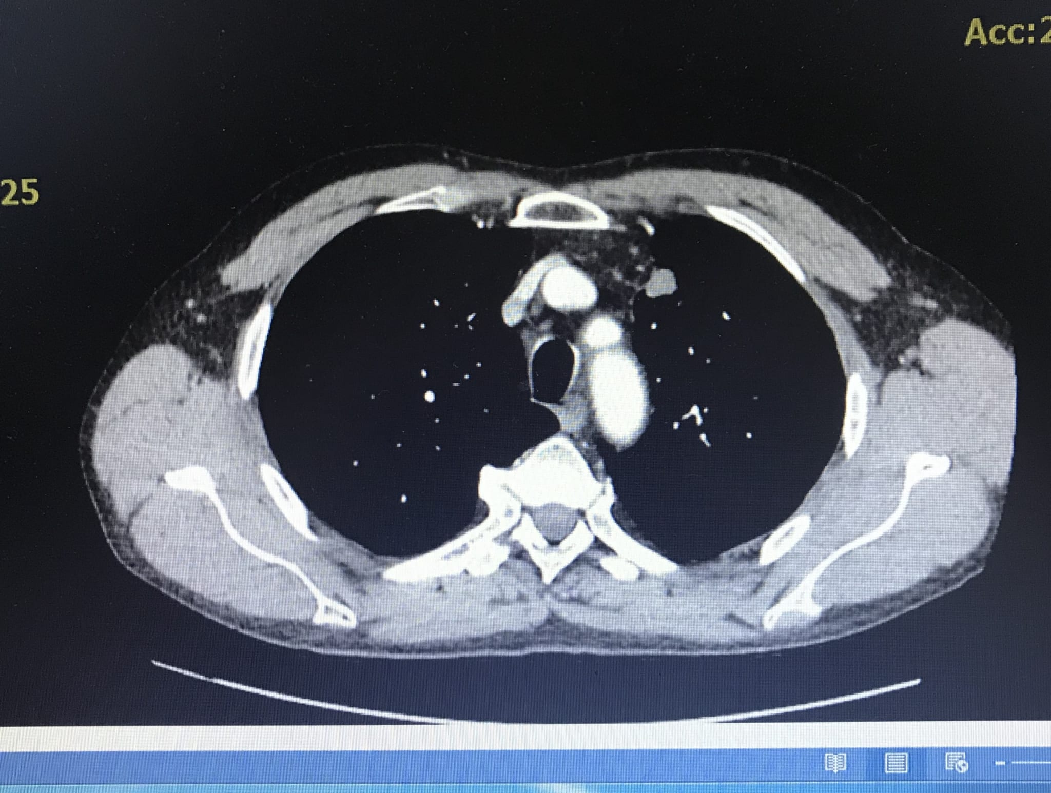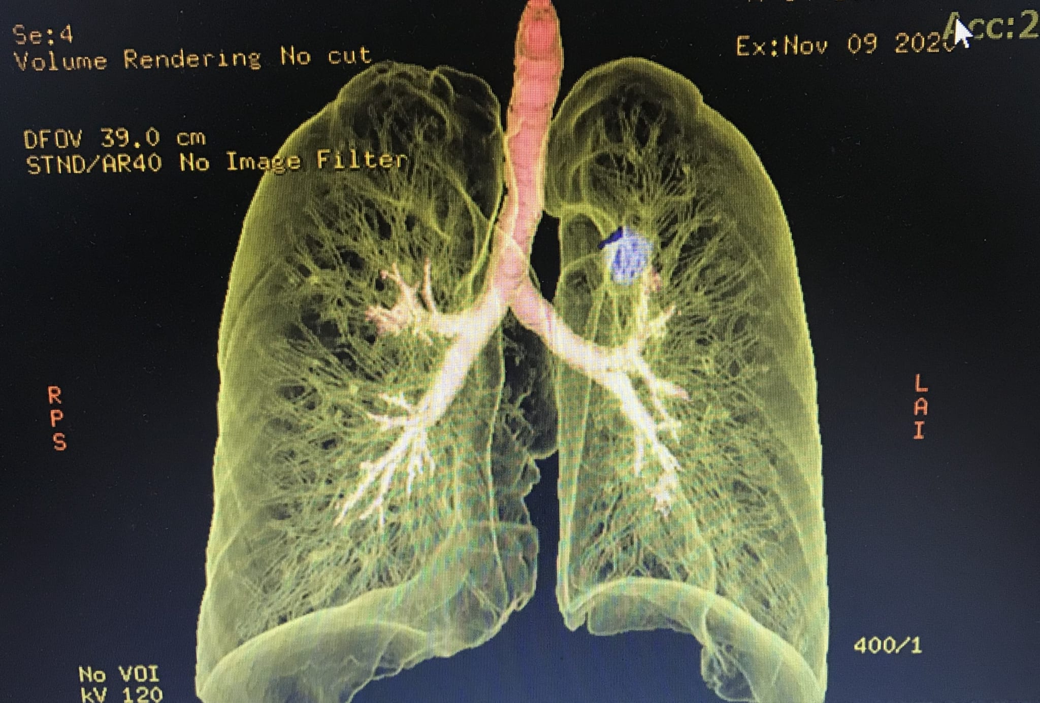 Bệnh nhân được hẹn về nhà theo dõi nhưng khi người bệnh đau tức ngực hai bên, ho đờm vàng nên được gia đình đưa đến khám tại Bệnh viện đa khoa Quốc tế Hải Phòng. Qua thăm khám và chụp CT ngực cho thấy, bệnh nhân có u thùy trên phổi kích thước 2,5×1,7cm.