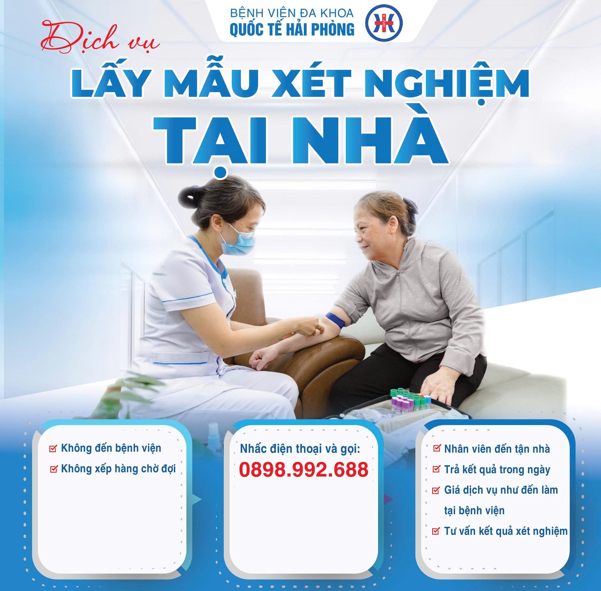 - Bước 2 – nhân viên đến lấy mẫu bệnh phẩm:nhân viên mặc áo có in logo của Bệnh viện đa khoa Quốc tế Hải Phòng, đến và tư vấn trực tiếp cho người có nhu cầu lấy mẫu bệnh phẩm tại nhà, chuẩn bị các dụng cụ lấy mẫu, thu phí xét nghiệm,