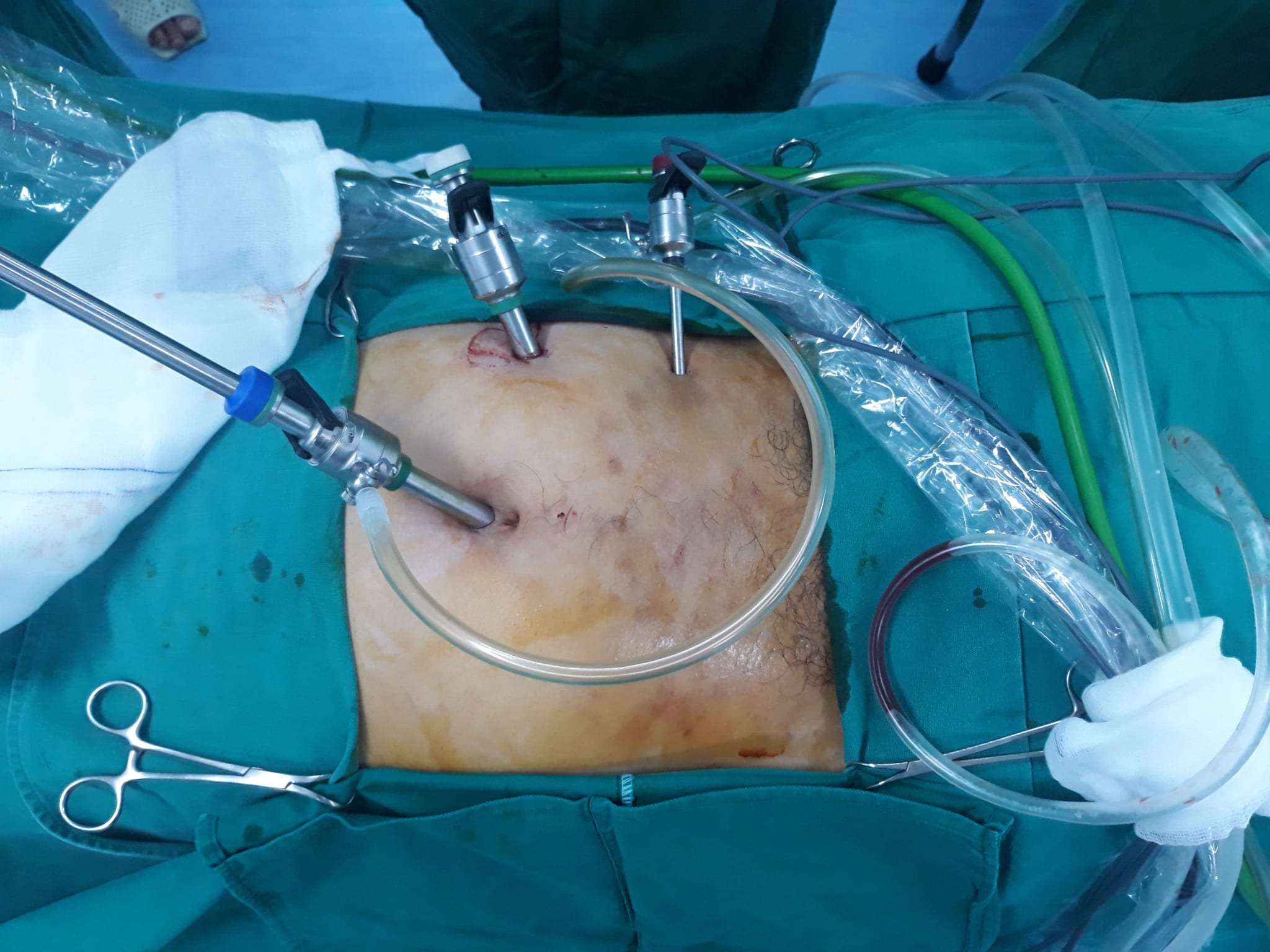 - Hình ảnh các trocart trên thành bụng trong quá trình phẫu thuật nội soi