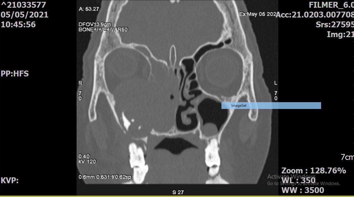 Chỉ còn kém 4 năm là cụ T.T.H tròn 100 tuổi. Khoảng 2 tuần nay, cụ xuất hiện sưng đau mắt bên phải, đã uống thuốc nhưng không đỡ. Gần đây, cụ xuất hiện thêm tình trạng chảy máu mũi bên phải. Cụ được gia đình đưa đến khám tại Bệnh viện đa khoa Quốc tế Hải Phòng. Qua thăm khám và thực hiện chụp CT scanner, bác sĩ Khoa Tai Mũi Họng phát hiện bệnh nhân có khối u từ xoang hàm phải phá vỡ cấu trúc xương của thành xoang hàm xâm lấn vào hốc mũi, phá hủy thành dưới ổ mắt xâm lấn vào trong hốc mắt của bệnh nhân.