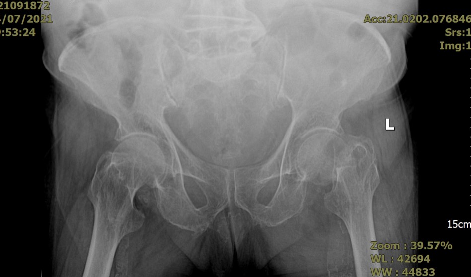 Bệnh nhân là cụ ông 91 tuổi, ở thị trấn Cát Bà, Cát Hải, Hải Phòng, ba ngày trước khi vào viện bệnh nhân bị ngã ngồi khi đang sinh hoạt tại nhà. Sau ngã bệnh nhân đau nhiều vùng háng trái và không thể ngồi dậy đi lại được, bệnh nhân chỉ có thể nằm và vệ sinh tại giường kèm đau đớn ngày đêm. Với tiền sử tăng huyết áp, tai biến mạch máu não cách đây 2 tháng, yếu nửa người trái, bệnh nhân được người nhà đưa vào Bệnh viện đa khoa Quốc tế Hải Phòng thăm khám. Tại đây, bệnh nhân được bác sĩ xác định gãy cổ xương đùi trái trên thể trạng già yếu có bệnh lý tim mạch rất nặng kèm theo. Nếu không can thiệp sớm sẽ dẫn đến nhiều biến chứng của gãy xương trên người già có thể nguy hiểm đến tính mạng.