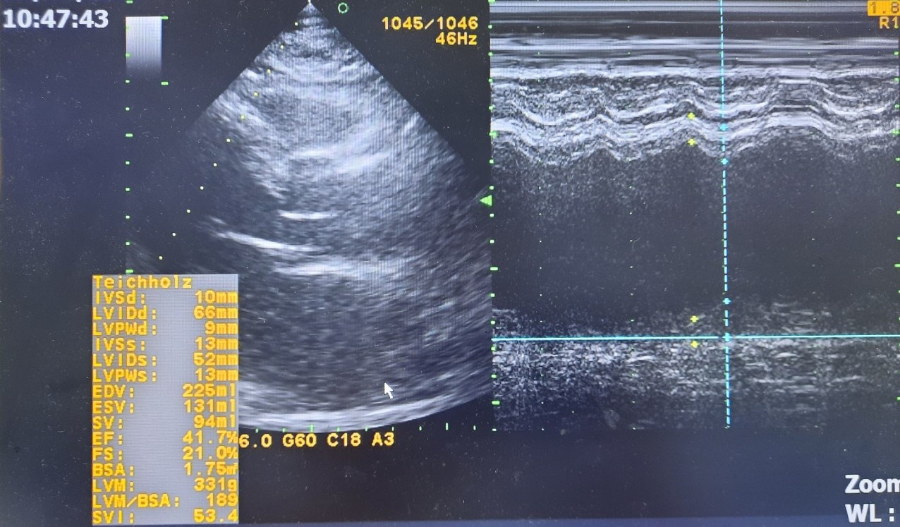 Tiếp nhận bệnh nhân trong tình trạng tim loạn nhịp hoàn toàn, mệt mỏi, khó thở nhiều, phổi RRPN giảm, nhiều hạt tophy tại khuỷu tay, bàn tay, gối, cùng cụt, da mỏng, giãn tĩnh mạch dưới da. Qua thực hiện các xét nghiệm cận lâm sàng cần thiết, phát hiện người bệnh có sỏi lớn ống mật chủ đoạn thấp sát chỗ đổ vào tá tràng gây giãn đường mật trong và ngoài gan. Kèm theo siêu âm tim buồng tim giãn lớn, chức năng tâm thu thất trái giảm nhiều, tăng áp lực động mạch phổi, nguy cơ cao trong quá trình gây mê và phẫu thuật, chưa kể các bệnh lý nền phức tạp khác: Đái tháo đường, Gout mạn biến chứng lên các khớp chi dưới, Suy thượng thận do thuốc.