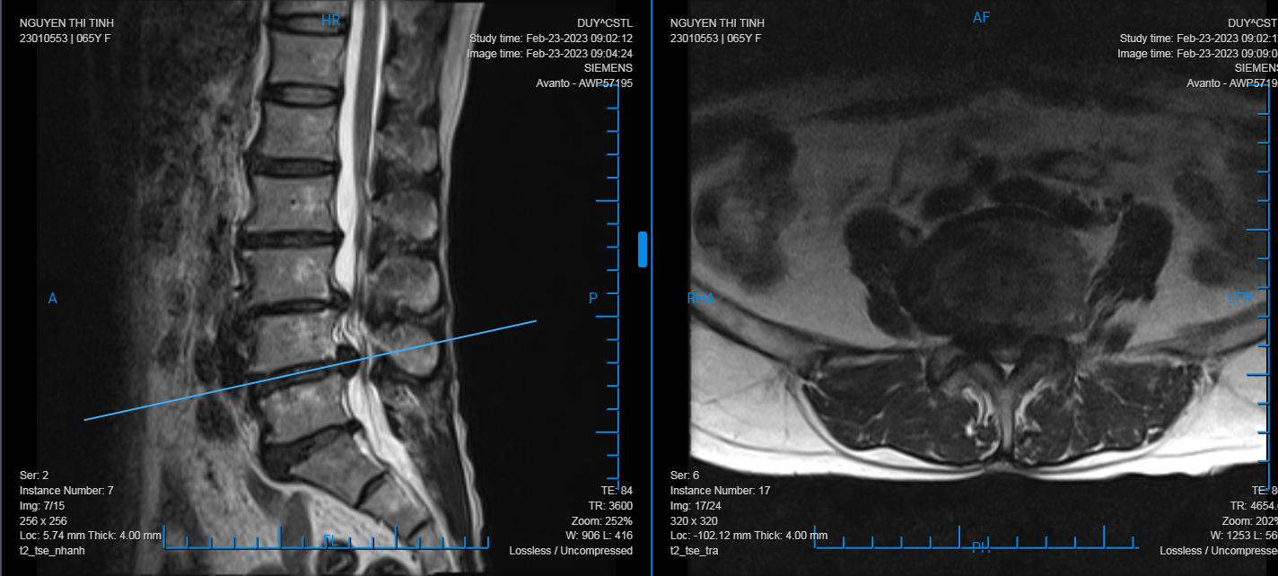 Bệnh nhân nữ, 65 tuổi đau cột sống thắt lưng lan xuống 2 chân 4 năm nay. Bệnh nhân đã khám và điều trị tại nhiều nơi nhưng không đỡ. Hiện tại, đau nhiều cột sống thắt lưng kèm lan xuống 2 chân, vận động đi lại khó khăn, bệnh nhân vào Bệnh viện đa khoa quốc tế Hải Phòng.