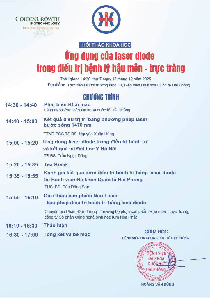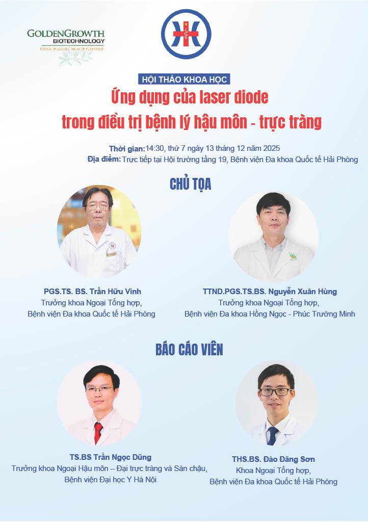 Hội thảo sẽ mang đến góc nhìn toàn diện về hiệu quả của LASER DIODE trong can thiệp, điều trị các bệnh lý hậu môn – trực tràng, với các báo cáo chuyên sâu từ những chuyên gia giàu kinh nghiệm: