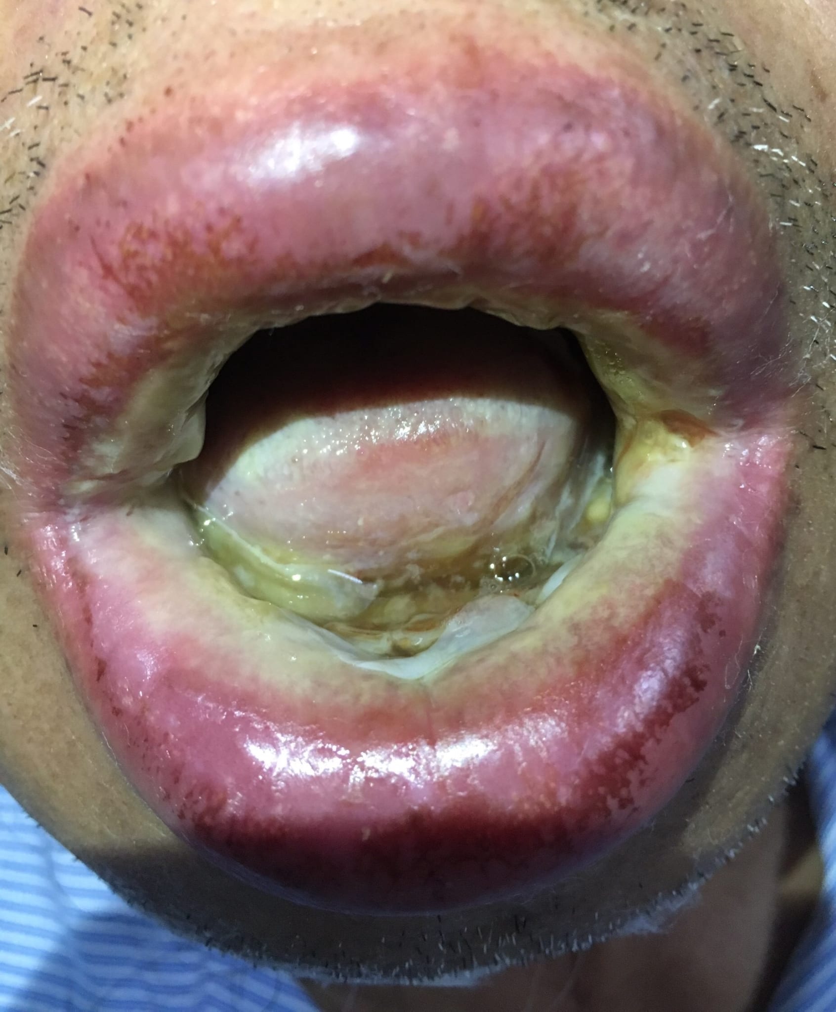 Vào Khoa Cấp cứu – Thân nhân tạo, Bệnh viện đa khoa Quốc tế Hải Phòng trong tình trạng sưng nề môi kèm theo bỏng rát toàn bộ vùng miệng, lưỡi co ngắn, không cử động được, niêm mạc miệng trắng, có bọng nước, bệnh nhân Đ.V.Q, 67 tuổi cho biết tình trạng trên xuất hiện sau khi người bệnh đến nhà bạn chơi, biết mình bị đau răng nên được người bạn cho thuốc và ngậm chữa đau răng.